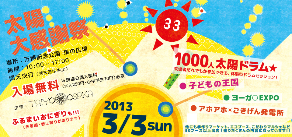 TAIYO33OSAKA began after the earthquake and tsunami disaster in eastern Japan on March 11th, 2011. Our activities are based in Osaka, the city renowned for its arts and comedy scenes. We are committed to cultivating an environment in which honesty and dialogue are encouraged; a future that our children can look forward to. We encourage people to increase and enrich their knowledge and appreciation of the issues surrounding energy and resources.